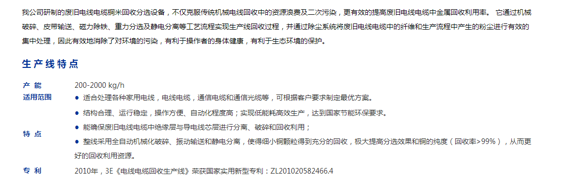 該銅米機是我公司自主研發(fā)的回收線之一,通常用來生產(chǎn)銅和回收塑料顆粒。具有結(jié)構(gòu)合理,運行穩(wěn)定等特點。它只需要喂料一次,配備分離器,該回收線具有大容量,我們可以根據(jù)客戶的要求進行相應(yīng)的改裝。