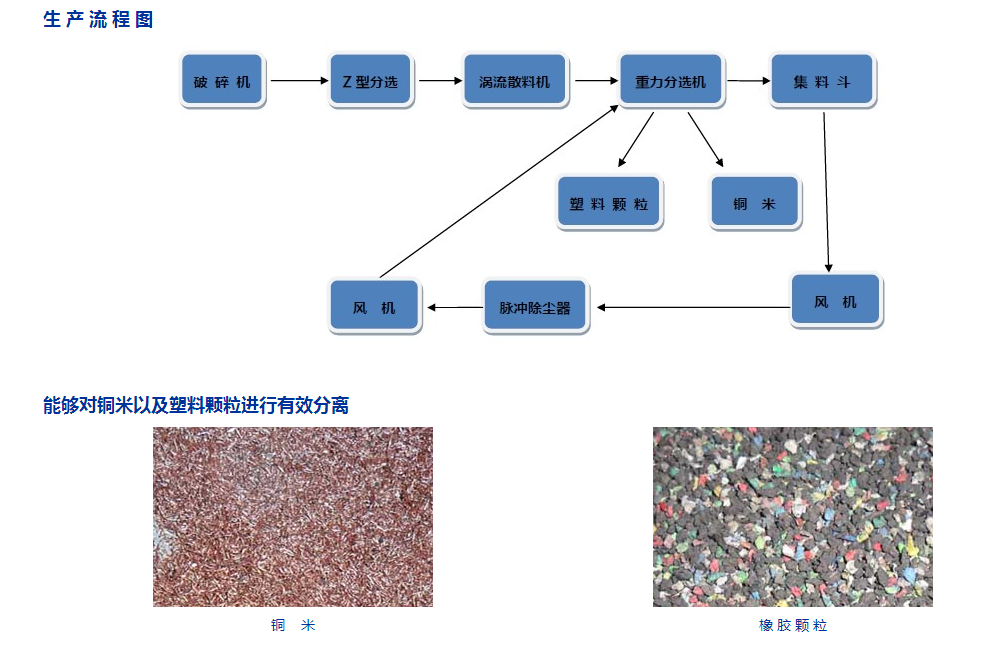 該銅米機是我公司自主研發(fā)的回收線之一,通常用來生產(chǎn)銅和回收塑料顆粒。具有結(jié)構(gòu)合理,運行穩(wěn)定等特點。它只需要喂料一次,配備分離器,該回收線具有大容量,我們可以根據(jù)客戶的要求進行相應(yīng)的改裝。
